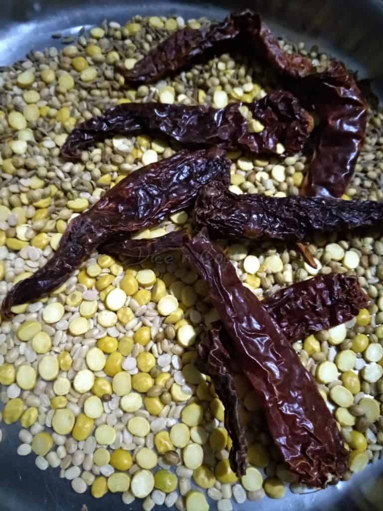 - Take a pan, roast channa dal and urd dal in coconut oil on medium flame, until they slightly change in colour. Take this out and roast coriander seeds, cumin, red chilies until they slightly change colour. Cool these roasted masala ingredients.