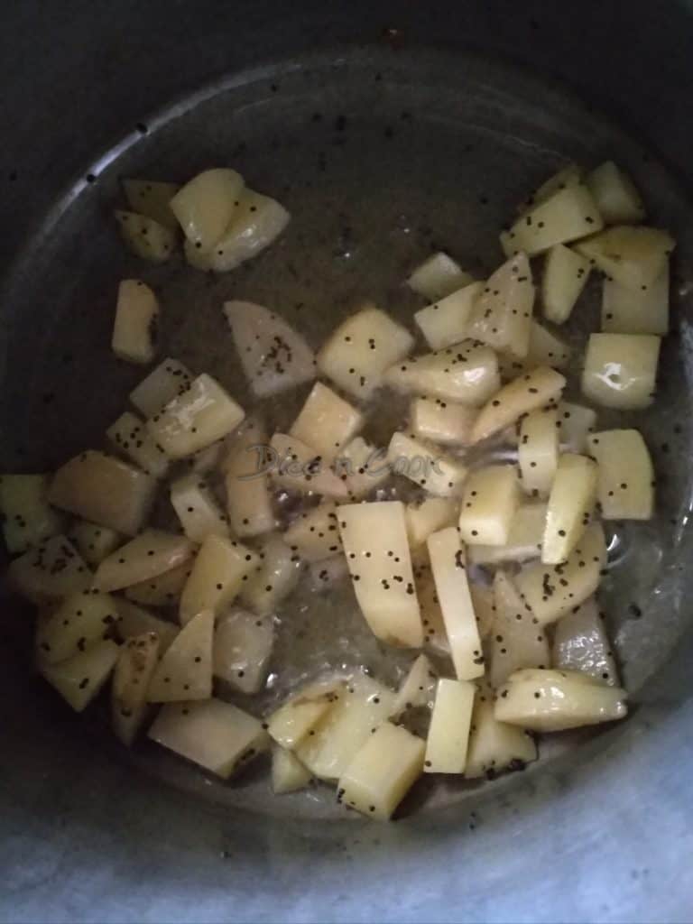 - Take a pressure cooker pan, add oil, ghee, mustard seeds, sauté well. Now add the aloo pieces and fry them well until they slightly turn golden. Add peas, powdered masala powder, fry well for a minute.