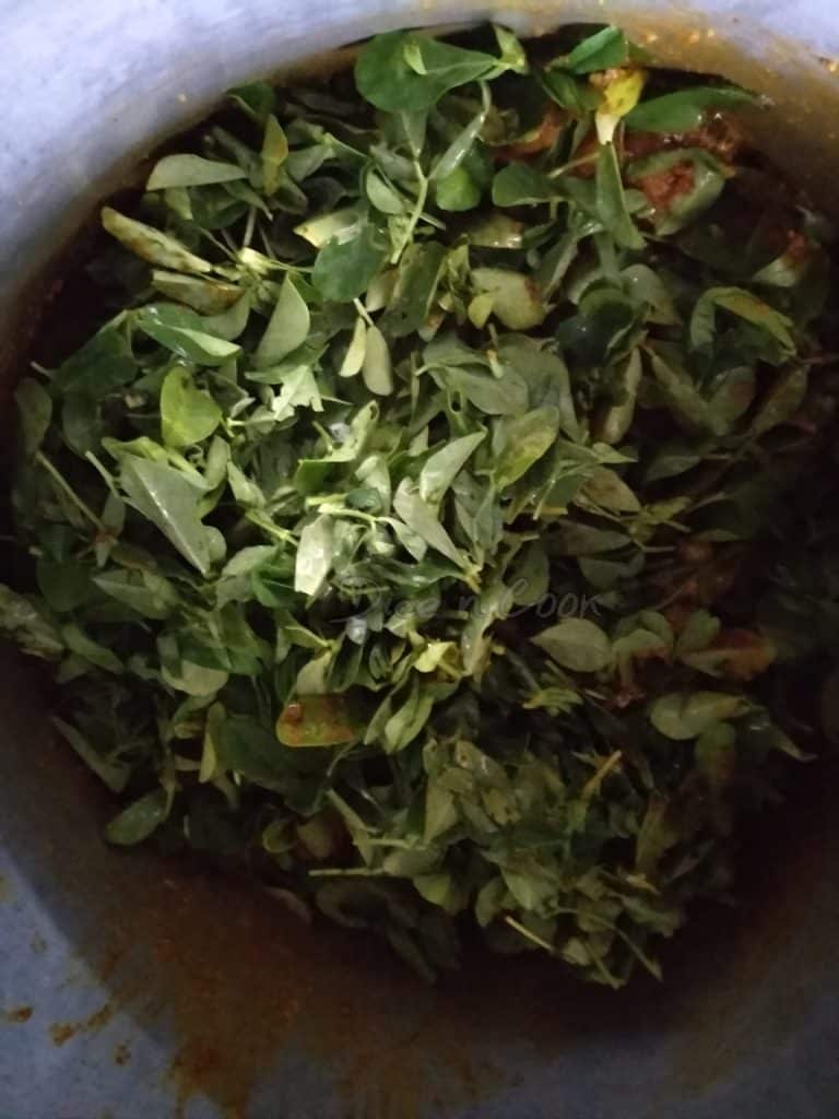 - Add the methi leaves and sauté well for 2 minutes. Next add the drained rice and fry for a minute.