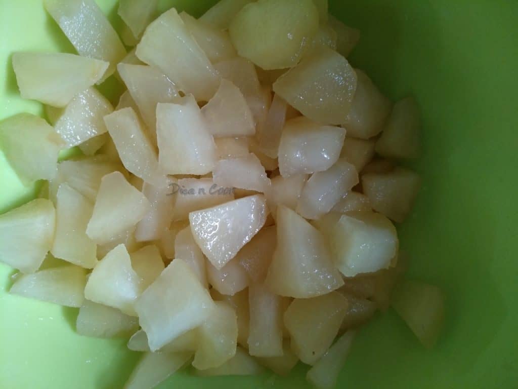 - Add lemon juice, boil once as the syrup reduces and coats well to the apple pieces. Cool this caramelized apple cubes.