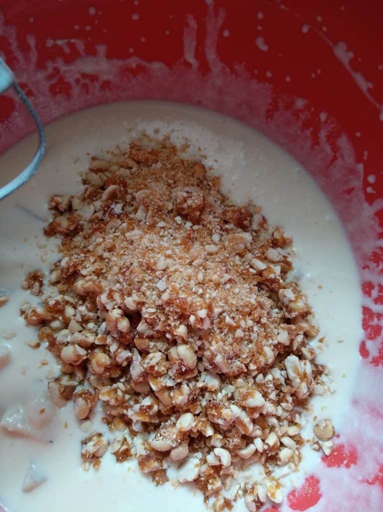 - Now add the caramelized apple mixture, crushed peanut brittles into the mixture.