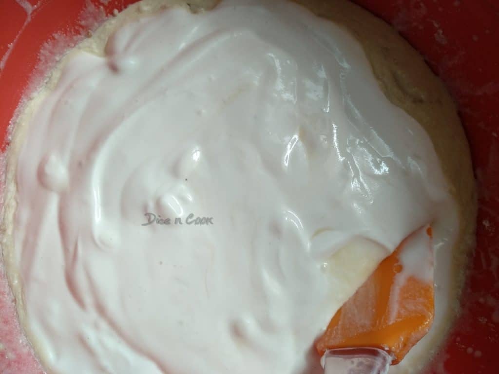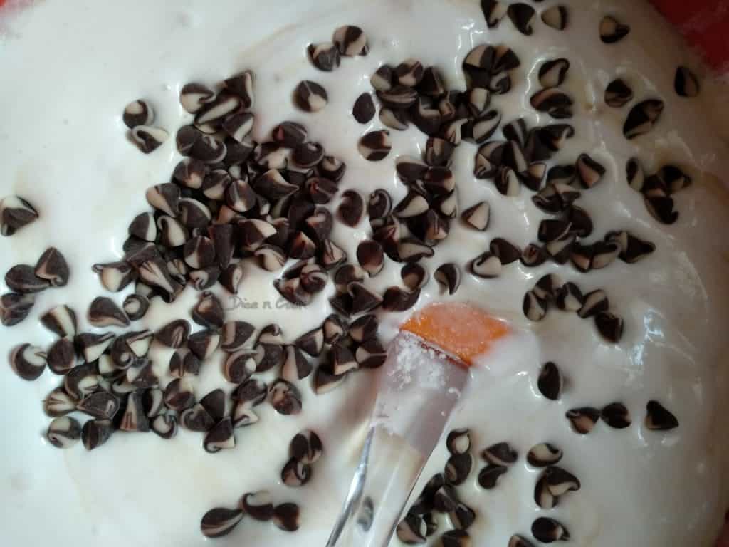 - Slowly add the refrigerated fresh whipped cream, chocochips to cream cheese mixture and gently mix everything.