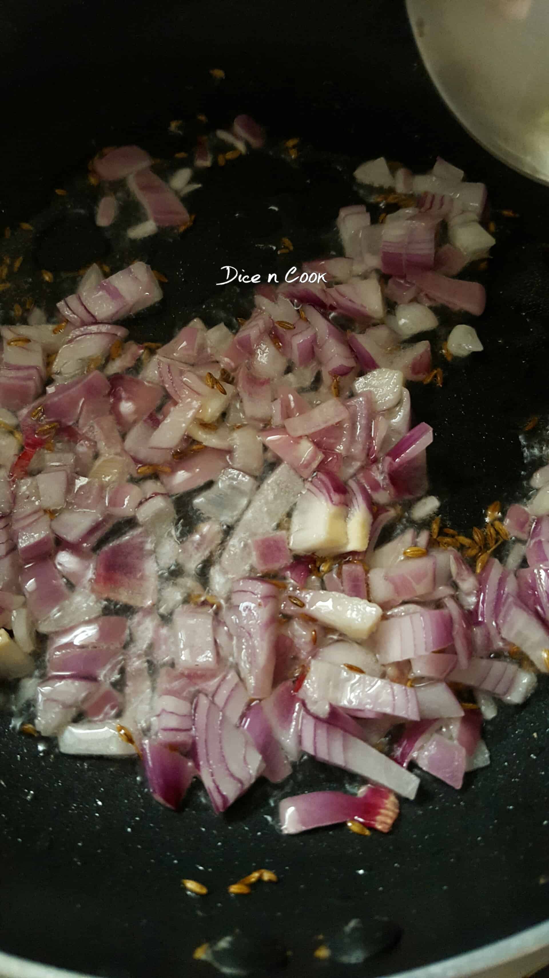 - Heat a pan, add oil, saute cumin, onion till golden.