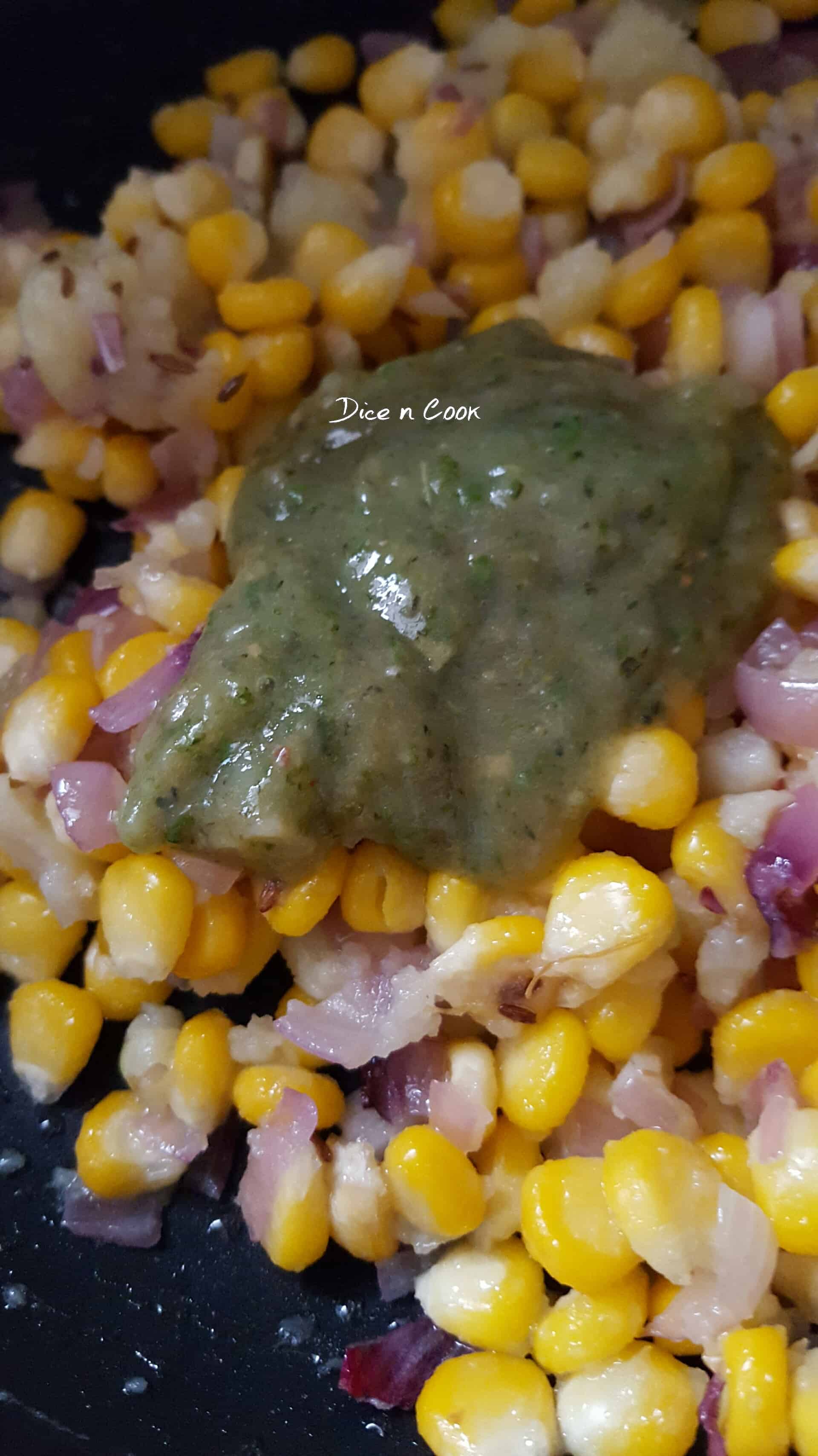 - Grind together coriander leaves, pudina leaves, garlic pods, ginger pieces into fine paste. Keep this aside.