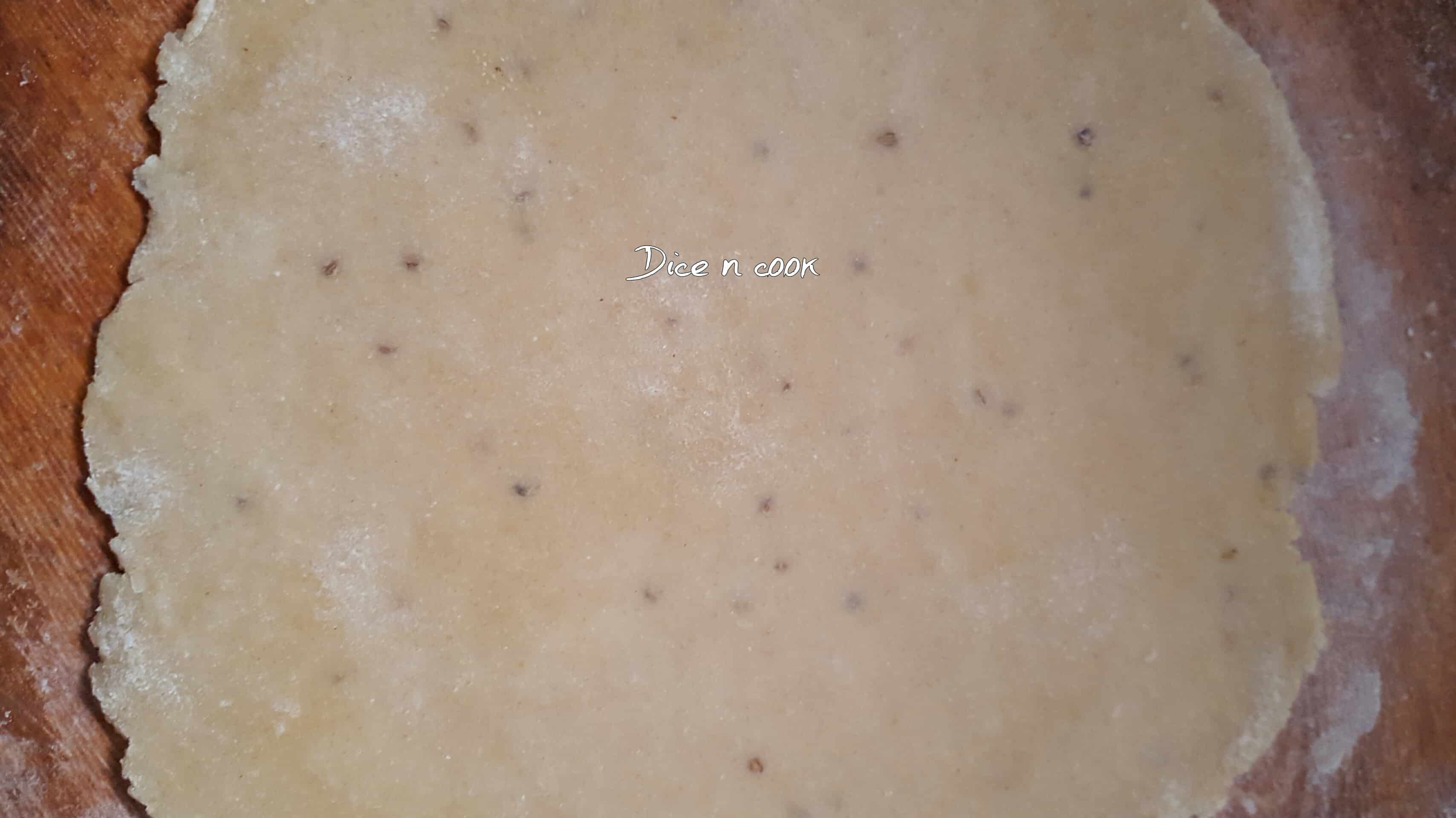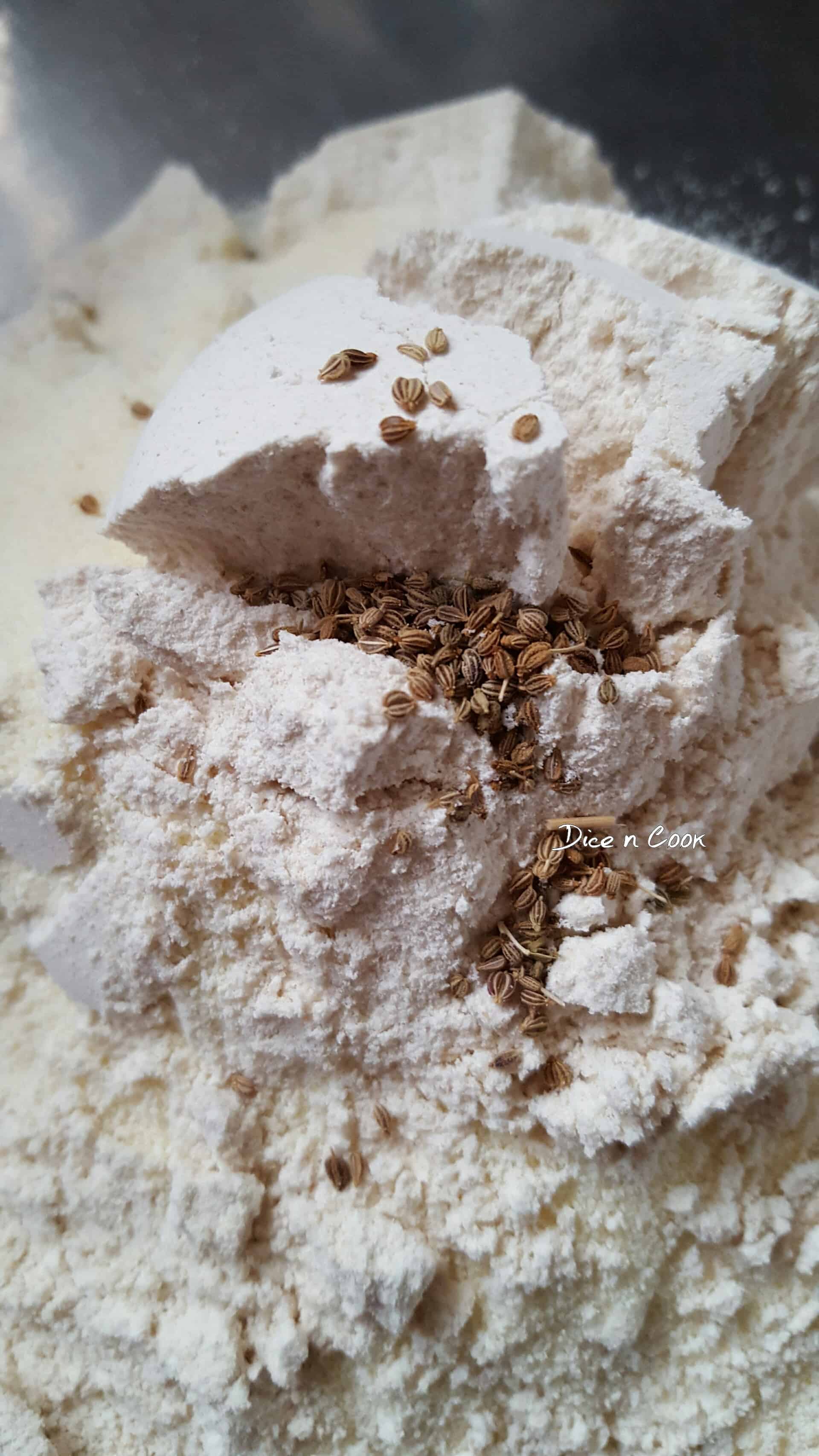 - First add wheat flour, fine semolina, ajwain, salt, mix well.