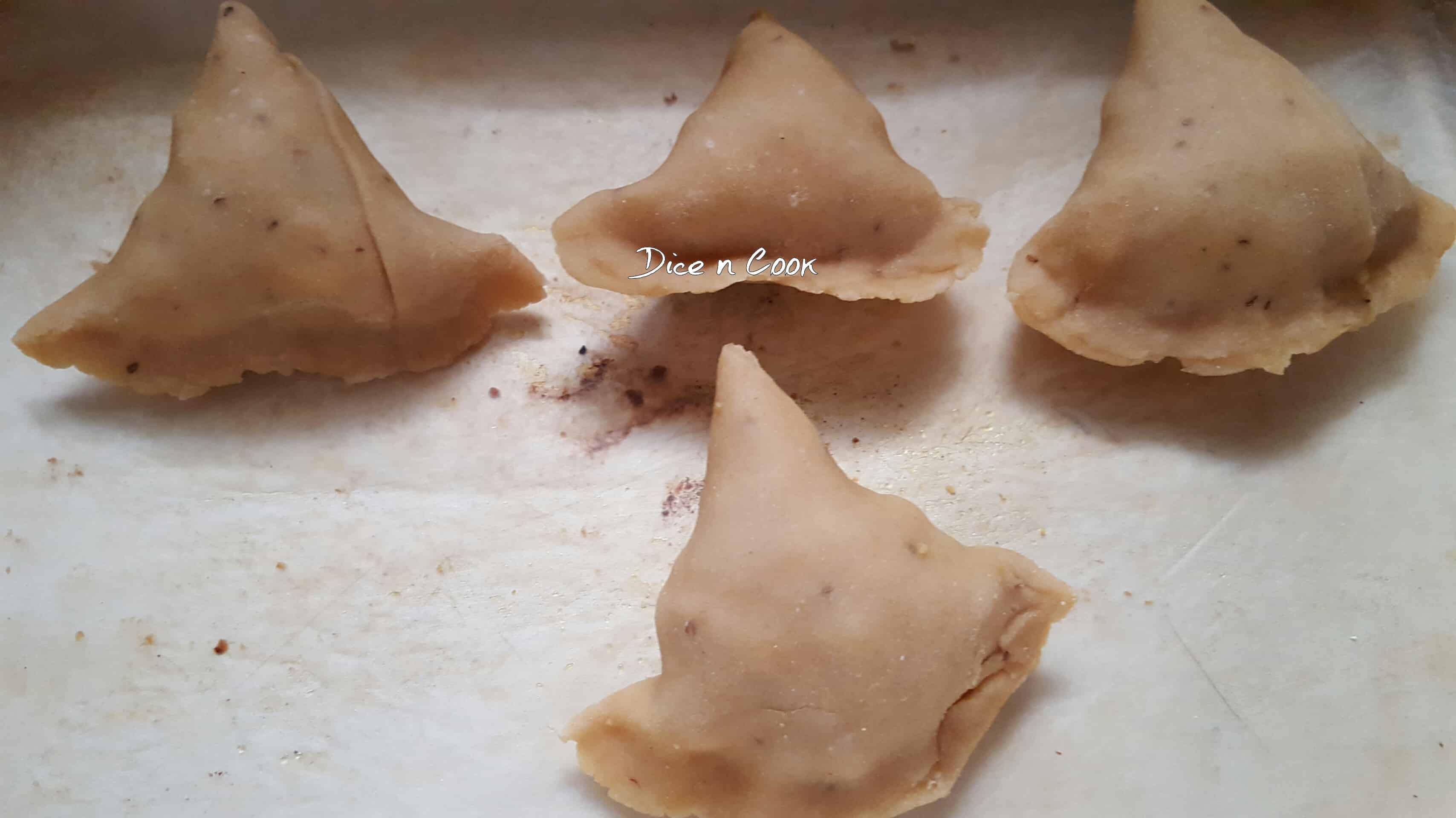 - Place the stuffed samosa on parchment paper lined baking tray.