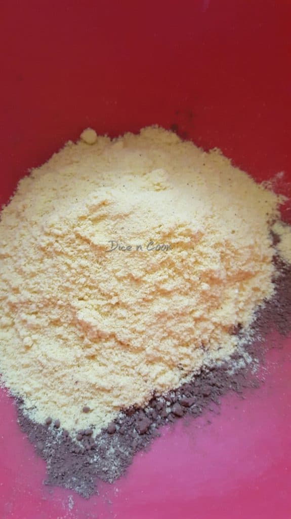 - Mix together cornmeal, coco powder, nutmeg powder in a bowl.