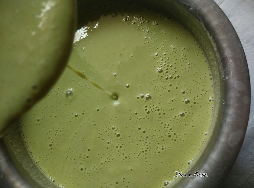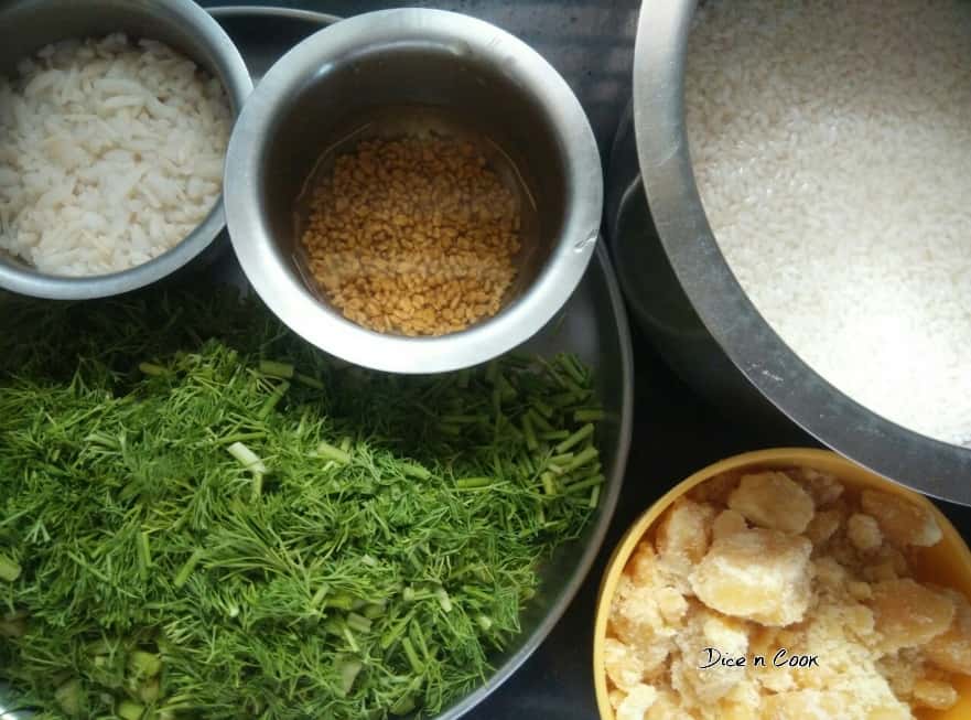 - Take a mixer jar and grind together rice, methi seeds, thick poha, finely chopped dill leaves into fine batter.