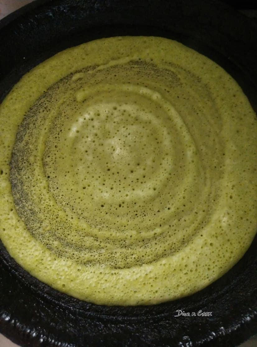 - Now spread dosa batter on hot tawa, close and cook on medium flame.