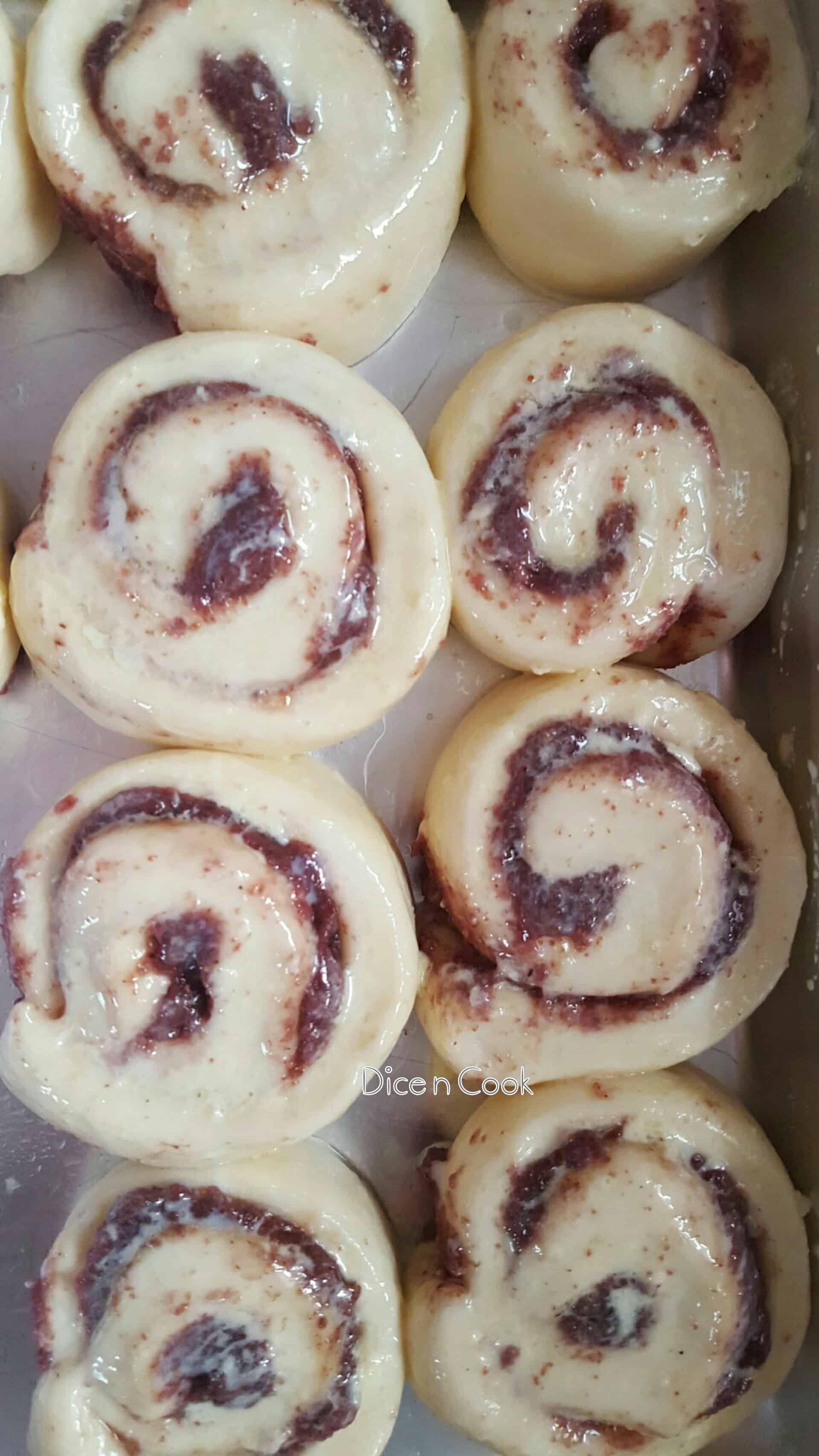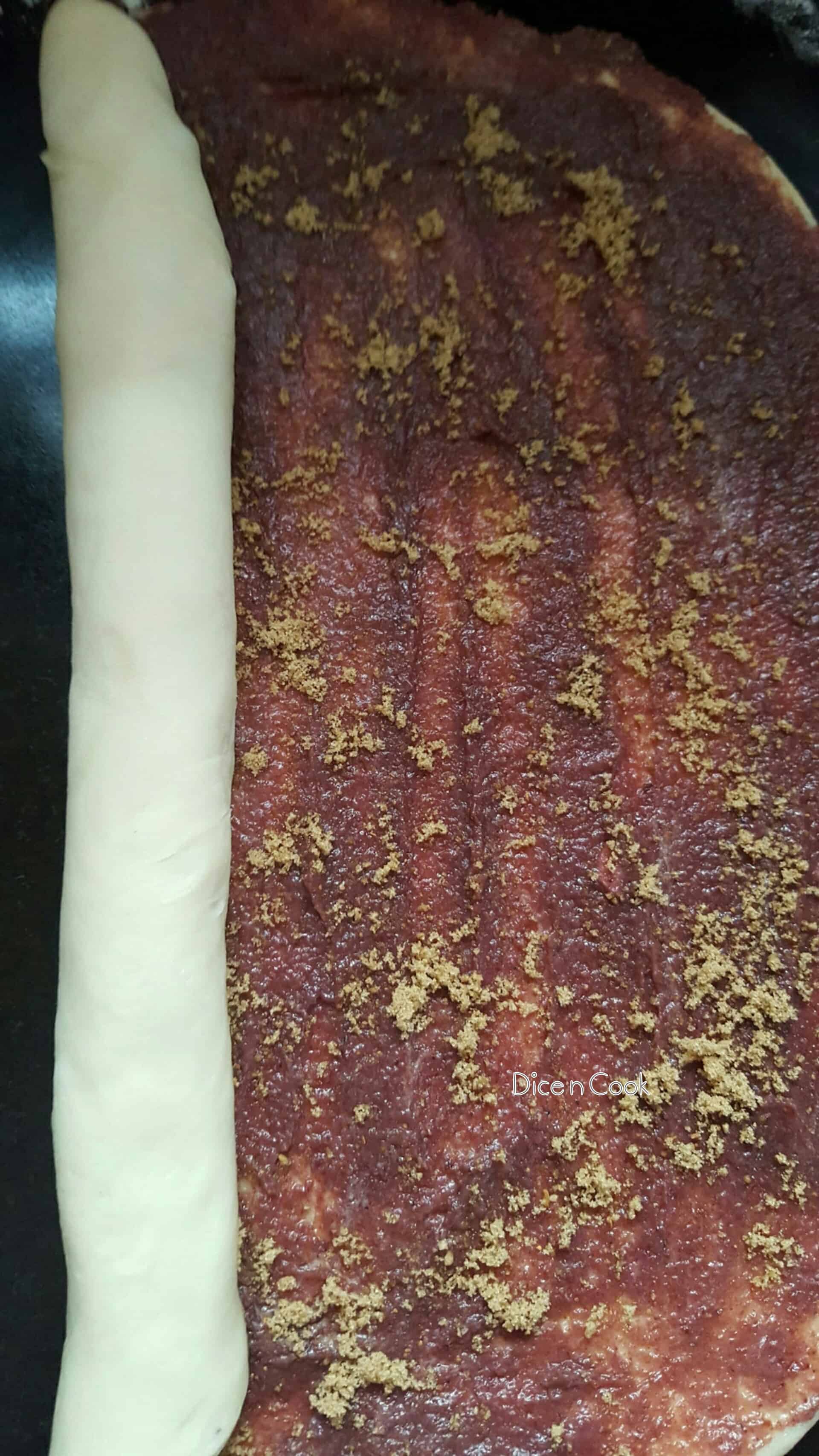 - Roll the dough into thin sheet using rolling pin on dusted platform. Apply butter evenly on the surface of dough sheet. Next apply the fresh fig jam evenly.