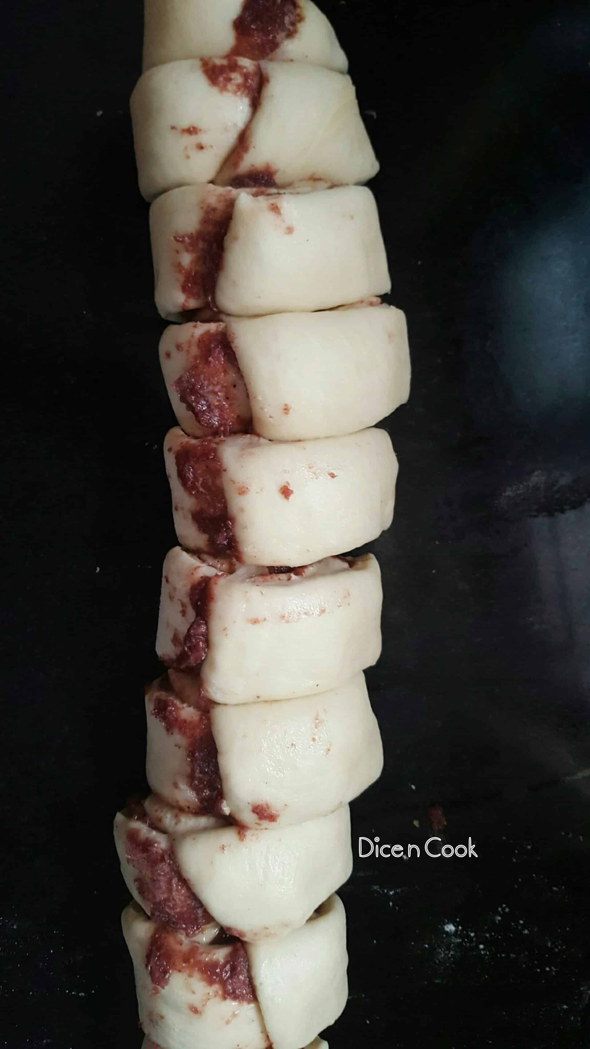 - Roll this tightly into a log and cut them vertically into equal sized rolls.