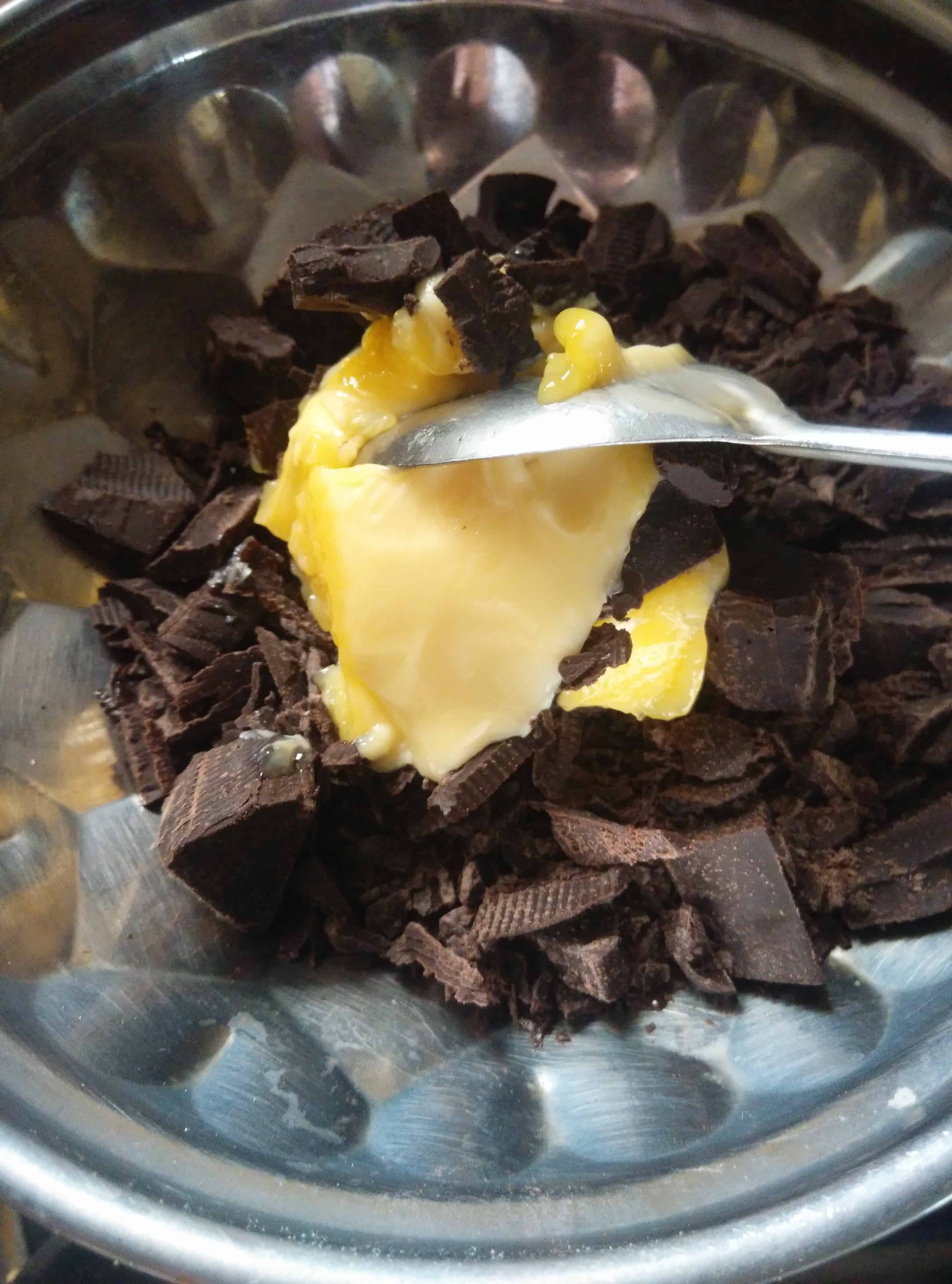 - Take a bowl, melt dark chocolate with butter on a double boiler on medium flame for 2 minutes.