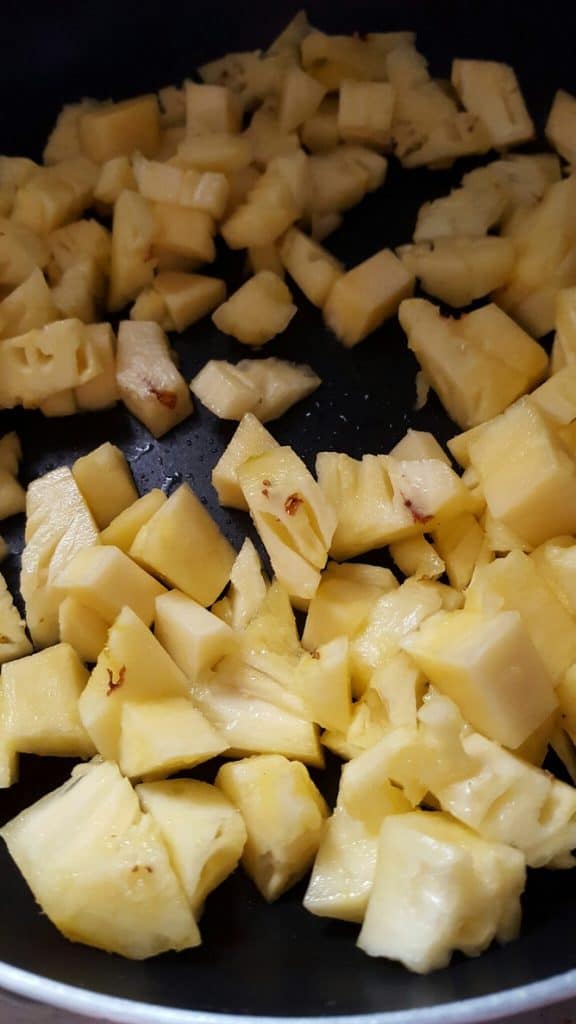 - Take a thick bottomed pan, add pineapple pieces, saute well on low to medium flame.