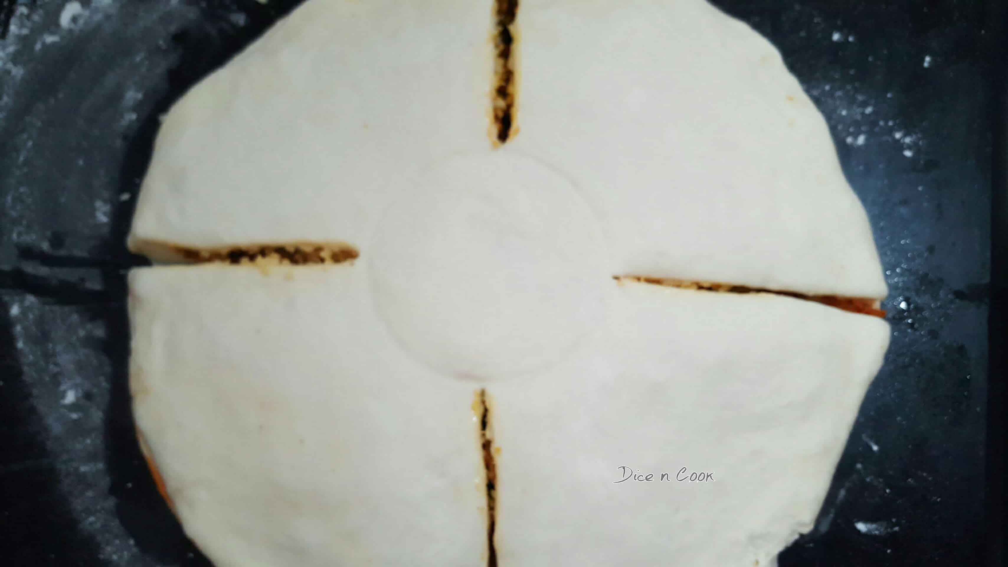 - Make a marking at the center using bowl. Now cut the dough into four equal parts.